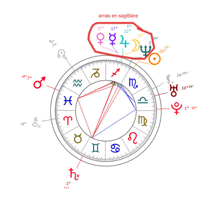 voilà un cas astrologique très intéressant...pour aller au delà de l'horoscope des magazines féminins que vous lisez en cachette au premier abord, soleil en scorpion....signe fixe d'eau (à rajouter dans les statuts  : que le trésorier soit obligatoirement d'un signe fixe  ) en carré avec mars ,maitre du signe : donc quand ça va trop vite, fred se plante en opposition avec saturne, donc quand ça va trop lentement, fred se plante héhéhé pas une seule planete en signe de terre comme vous pouvez le voir sur le schéma, amas massif de planètes en sagittaire (comme moi  d'ailleurs), dont jupiter, maitre du sagittaire, lune, mercure, venus, neptune il va de soi que cet amas prend le dessus sur le soleil surtout avec la conjonction lune jupiter qui écrase tout conjonction mercure venus : très bon pour faire rentrer les cotises donc pour l'horoscope, il faut lire ...sagittaire